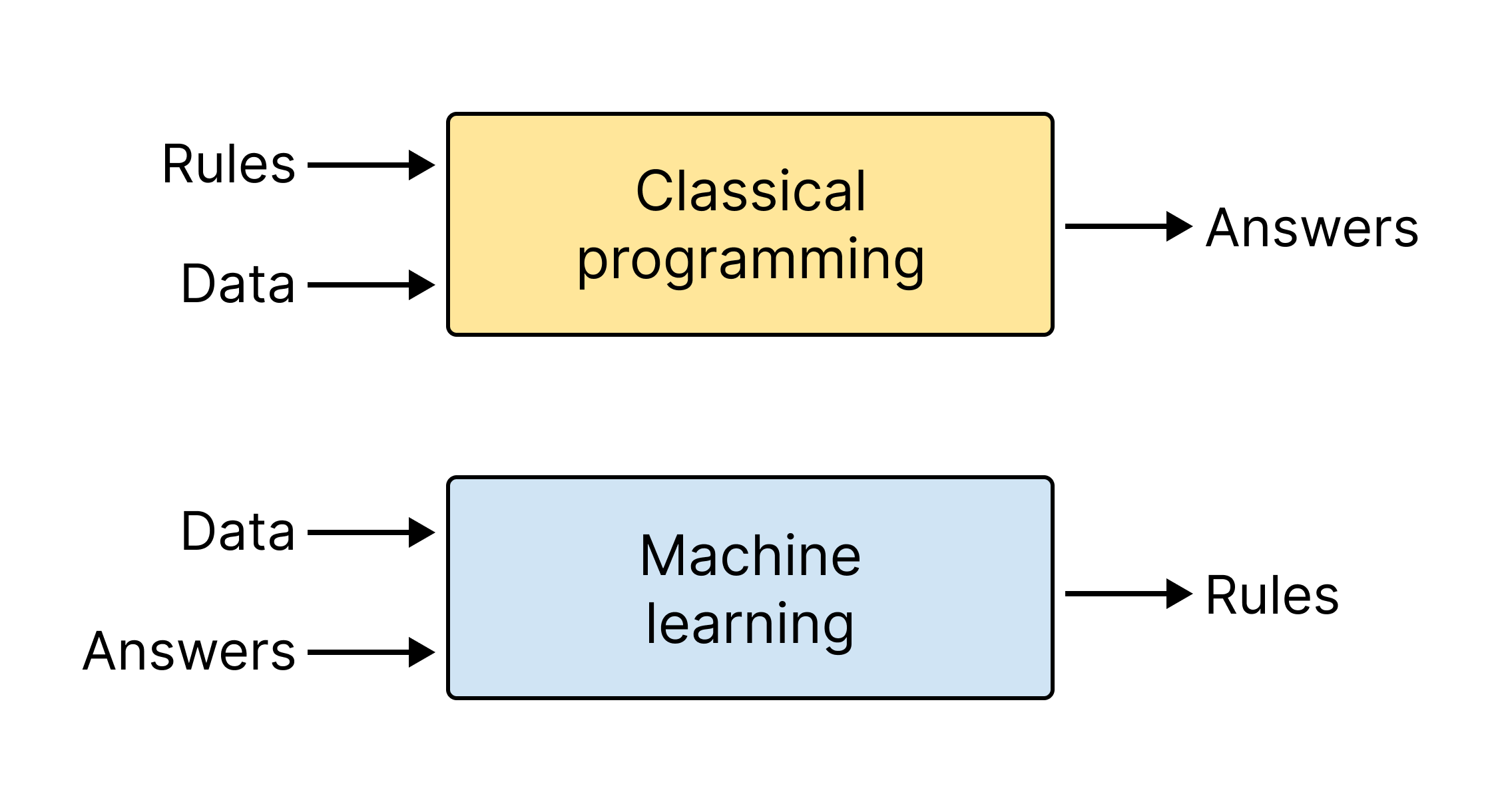 A machine learning system is trained rather than explicitly programmed. It’s presented with many examples relevant to a task, and it finds statistical structure in these examples that eventually allows the system to come up with rules for automating the task. For instance, if you wished to automate the task of tagging your vacation pictures, you could present a machine learning system with many examples of pictures already tagged by humans, and the system would learn statistical rules for associating specific pictures with specific tags like “landscape” and “food.”