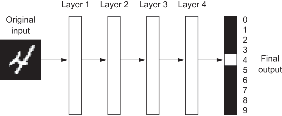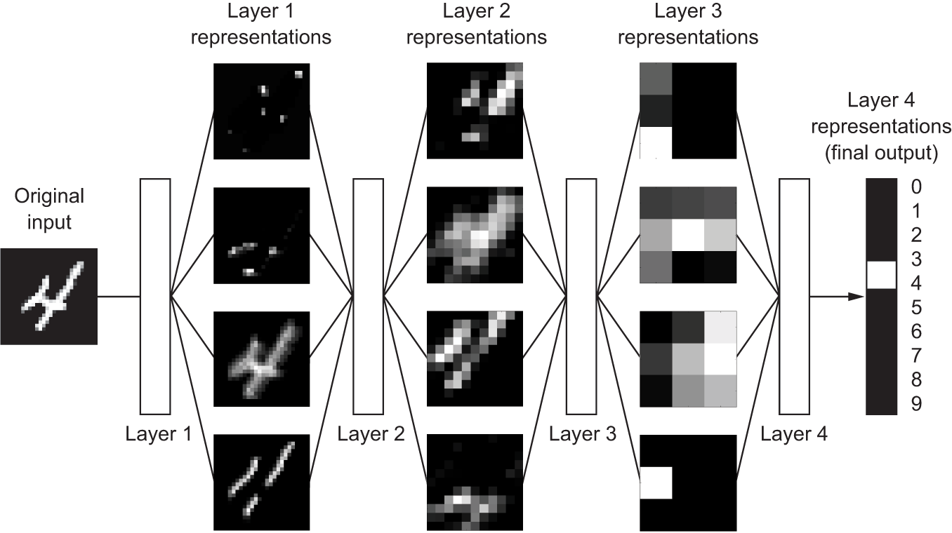 What do the representations learned by a deep learning algorithm look like? Let’s examine how a network several layers deep (see figure 1.5) transforms an image of a digit to recognize what digit it is.
