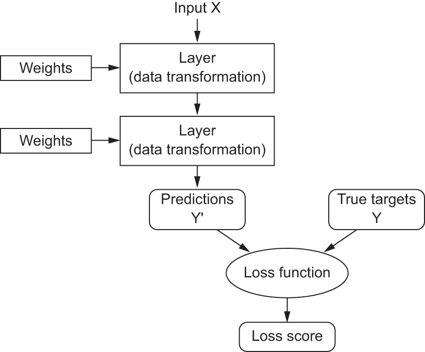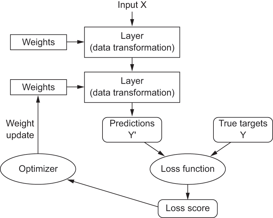 Initially, the weights of the network are assigned random values, so the network merely implements a series of random transformations. Naturally, its output is far from what it should ideally be, and the loss score is accordingly very high. But with every example the network processes, the weights are adjusted a little in the correct direction, and the loss score decreases. This is the training loop, which, repeated a sufficient number of times (typically tens of passes over thousands of examples), yields weight values that minimize the loss function. A network with a minimal loss is one for which the outputs are as close as they can be to the targets: a trained network. Once again, it’s a simple mechanism that, once scaled, ends up looking like magic.