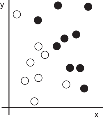 As you can see, we have a few white points and a few black points. Let’s say we want to develop an algorithm that can take a point’s (x, y) coordinates and output whether that point is likely black or white. In this case,