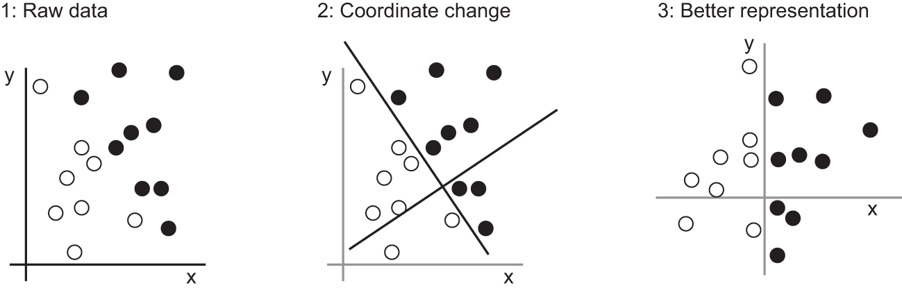 In this new coordinate system, the coordinates of our points can be said to be a new representation of our data. And it’s a good one! With this representation, the black/white classification problem can be expressed as a simple rule: “Black points are such that x > 0,” or “White points are such that x < 0.” This new representation, combined with this simple rule, neatly solves the classification problem.