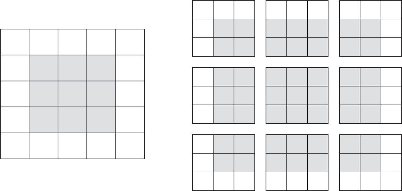 Consider a 5 × 5 feature map (25 tiles total). There are only 9 tiles around which we can center a 3 × 3 window, forming a 3 × 3 grid (see figure 8.5). Hence, the output feature map will be 3 × 3. It shrinks a little: by exactly two tiles alongside each dimension, in this case. We can see this border effect in action in the earlier example: we start with 28 × 28 inputs, which become 26 × 26 after the first convolution layer.