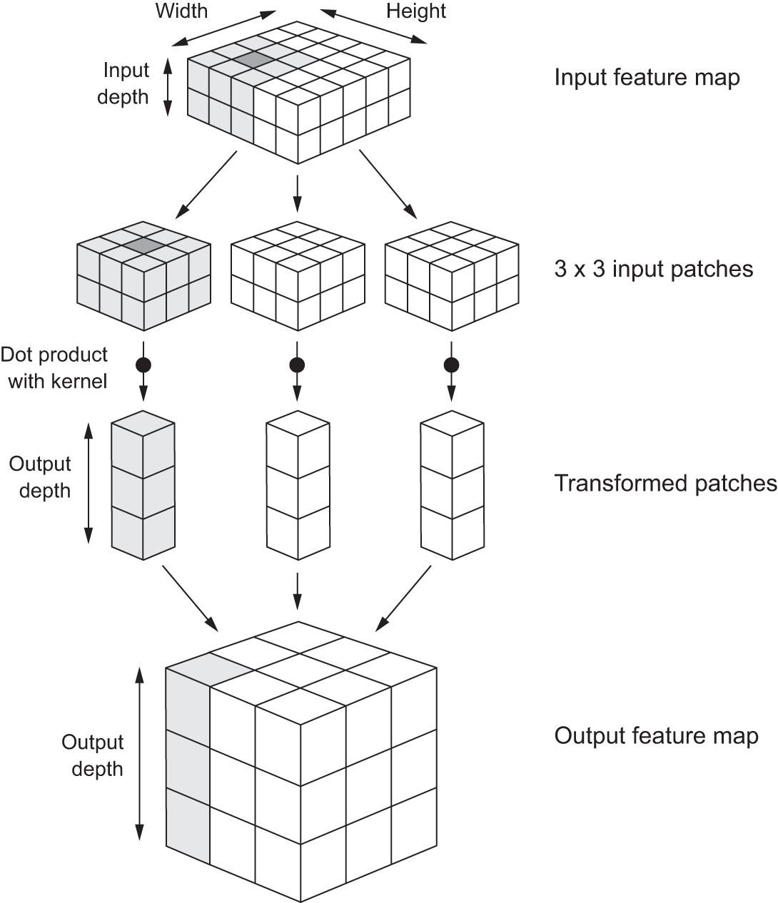 A convolution works by sliding these windows of size 3 × 3 or 5 × 5 over the 3D input feature map, stopping at every possible location, and extracting the 3D patch of surrounding features (shape (window_height, window_width, input_depth)). Each such 3D patch is then transformed into a 1D vector of shape (output_depth), which is done via a tensor product with a learned weight matrix, called the convolution kernel; the same kernel is reused across every patch. All of these vectors (one per patch) are then spatially reassembled into a 3D output map of shape (height, width, output_depth). Every spatial location in the output feature map corresponds to the same location in the input feature map (for example, the lower-right corner of the output contains information about the lower-right corner of the input). For instance, with 3 × 3 windows, the vector output[i, j, ] comes from the 3D patch input[(i-1):(i+1), (j-1):(j+1), ]. The full process is detailed in figure 8.4.