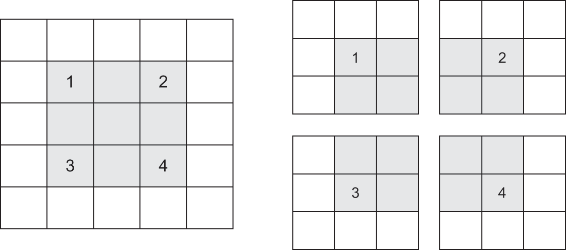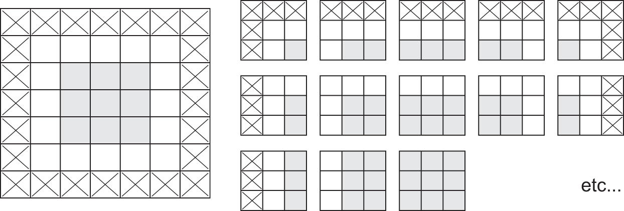 If we want to get an output feature map with the same spatial dimensions as the input, we can use padding. Padding consists of adding an appropriate number of rows and columns on each side of the input feature map to make it possible to fit centered convolution windows around every input tile. For a 3 × 3 window, we add one column on the right, one column on the left, one row at the top, and one row at the bottom. For a 5 × 5 window, we add two rows (see figure 8.6).