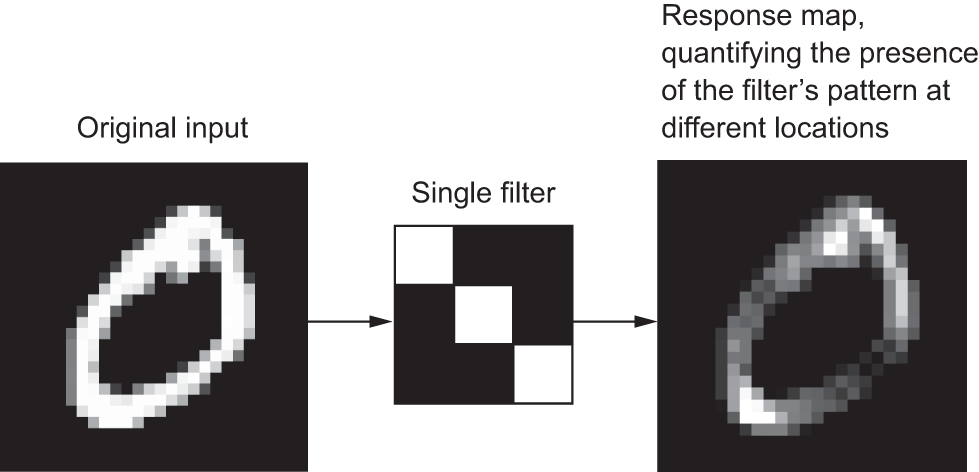 In the MNIST example, the first convolution layer takes a feature map of size (28, 28, 1) and outputs a feature map of size (26, 26, 64): it computes 64 filters over its input. Each of these 64 output channels contains a 26 × 26 grid of values, which is a response map of the filter over the input, indicating the response of that filter pattern at different locations in the input (see figure 8.3). That is what the term feature map means: every dimension in the depth axis is a feature (or filter), and the rank-2 tensor output[, , n] is the 2D spatial map of the response of this filter over the input.