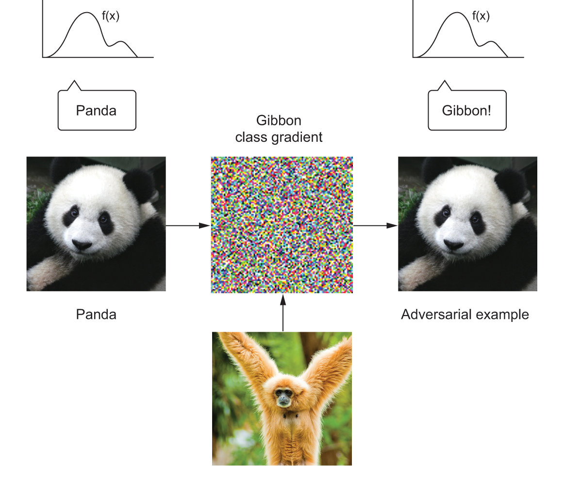 Similarly, through gradient ascent, you can slightly modify an image to maximize the class prediction for a given class. By taking a picture of a panda and adding a gibbon gradient to it, we can get a neural network to classify the panda as a gibbon (see figure 19.3). This demonstrates both the brittleness of these models and the deep difference between their input-to-output mapping and our human perception.