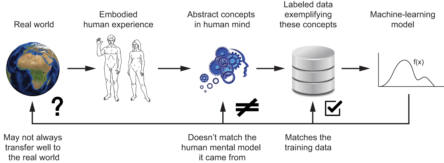 Our own understanding of images, sounds, and language is grounded in our sensorimotor experience as humans. Machine learning models have no access to such experiences and thus can’t understand their inputs in a human-relatable way. By feeding a large number of training examples into our models, we get them to learn a geometric transform that maps data to human concepts on a specific set of examples, but this mapping is a simplistic sketch of the original model in our minds—the one developed from our experience as embodied agents. It’s like a dim image in a mirror (see figure 19.4). The models you create will take any shortcut available to fit their training data.