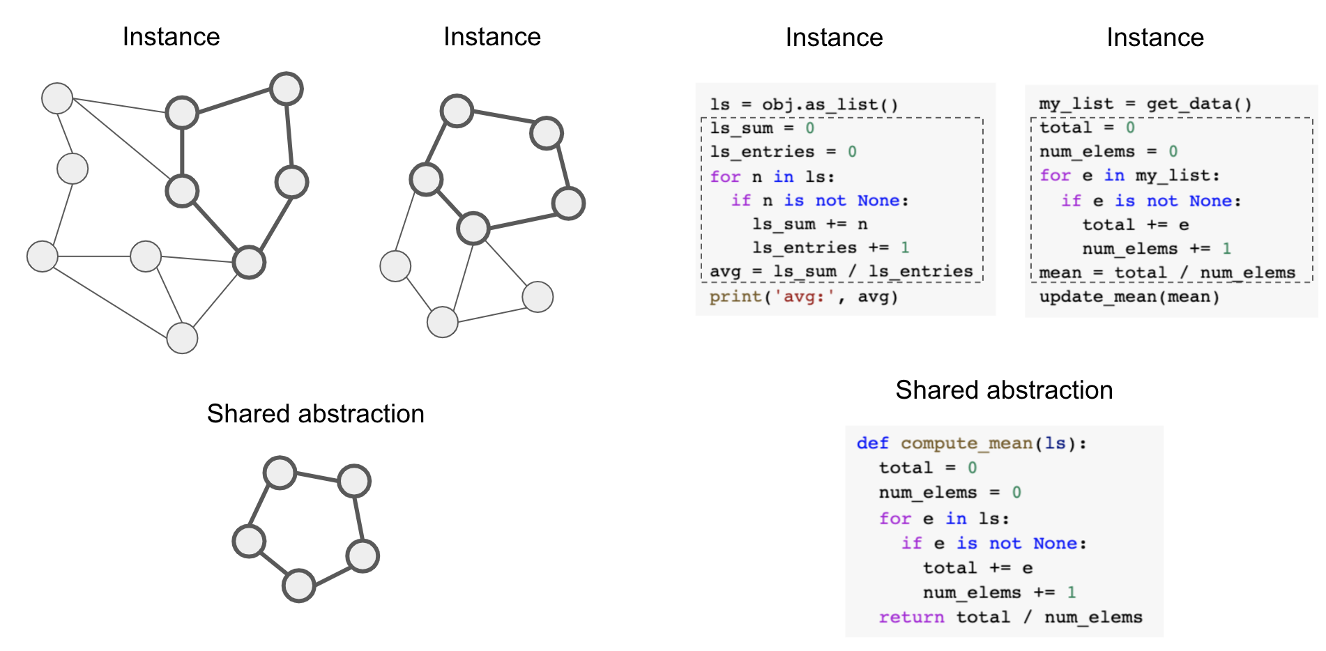 In software engineering, you often write different functions or classes that seem to have a lot in common. When you notice these redundancies, you start asking: Could there be a more abstract function that performs the same job that could be reused twice? Could there be an abstract base class that both of your classes could inherit from? The definition of abstraction you’re using here corresponds to a program-centric analogy. You’re not trying to compare your classes and functions by how similar they look, the way you’d compare two human faces, via an implicit distance function. Rather, you’re interested in whether there are parts of them that have exactly the same structure. You’re looking for what is called a subgraph isomorphism (see figure 19.13): programs can be represented as graphs of operators, and you’re trying to find subgraphs (program subsets) that are exactly shared across your different programs.