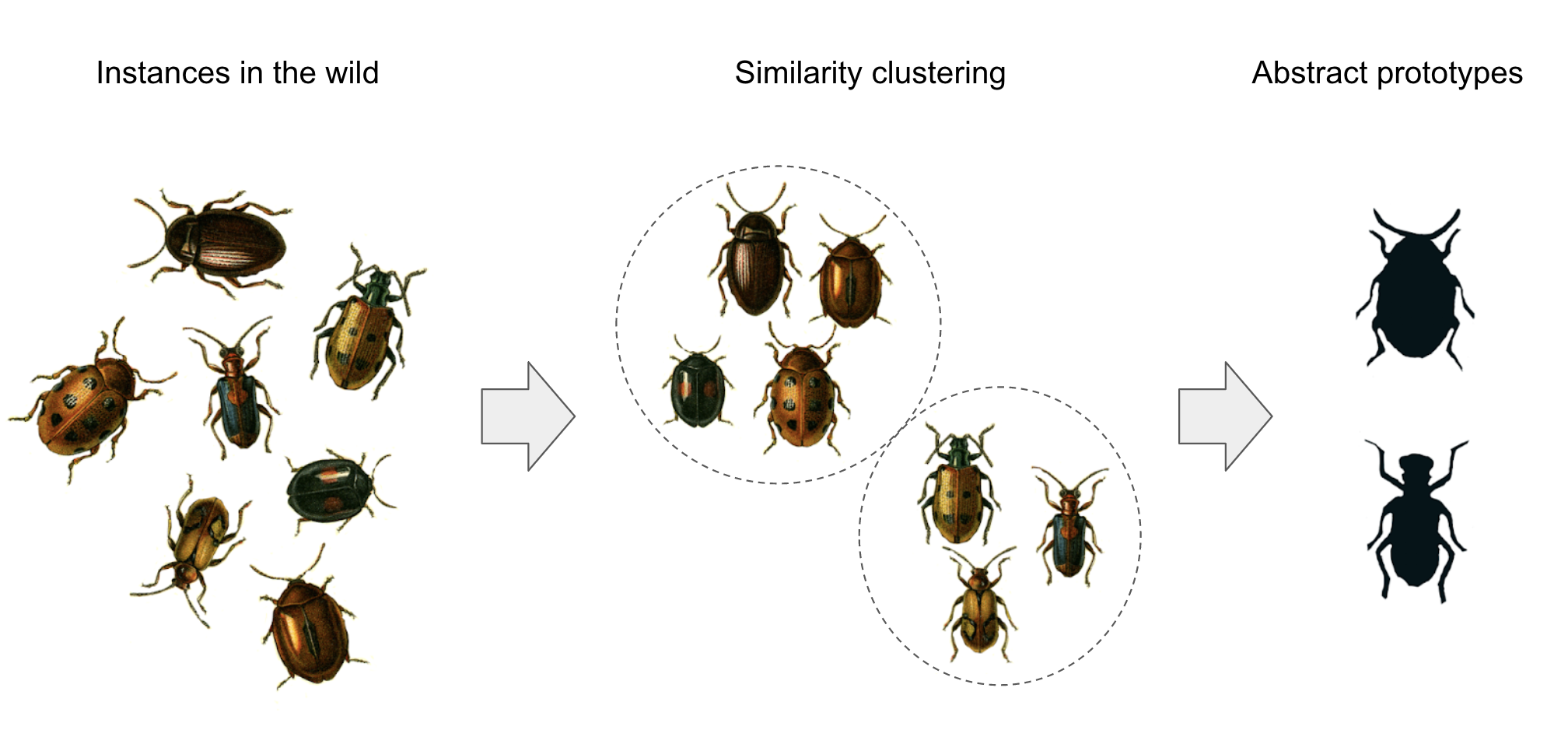 Let’s say you come across a number of different beetles in your backyard, belonging to multiple species. You’ll notice similarities between them. Some will be more similar to one another, and some will be less similar: the notion of similarity is implicitly a smooth, continuous distance function that defines a latent manifold where your instances live. Once you’ve seen enough beetles, you can start clustering more similar instances together and merging them into a set of prototypes that captures the shared visual features of each cluster (figure 19.12). This prototype is abstract: it doesn’t look like any specific instance you’ve seen, although it encodes properties that are common across all of them. When you encounter a new beetle, you won’t need to compare it to every single beetle you’ve seen before to know what to do with it. You can simply compare it to your handful of prototypes to find the closest prototype—the beetle’s category—and use it to make useful predictions: Is the beetle likely to bite you? Will it eat your apples?